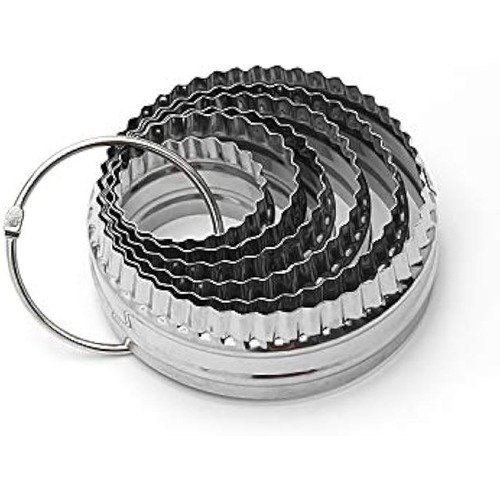 With one side of the Cut-Outs having a straight edge and the other with a crinkle edge, you can cut 12 designs from the Wilton Round Fondant Double Cut-Outs 6-Piece Set. With six circular graduated sizes, you can make intricately layered details with two edge finishes for any fondant cake. Circle cutter sizes, from smallest to largest: 7/8 in., 1 1/4 in., 1 7/16 in., 2 in., 2 3/8 in., 2 13/16 in. Cut 12 different motifs from the Wilton 6-Pc. Round Fondant Double Cut-Outs Set – one cutter edge cuts smooth and the other cuts crinkle-edge. With six circular graduated sizes in one set, make intricately layered details with two edge finishes for any fondant cake. Mix smooth-edged circles with scallop-edged circles for your next fondant cake design. Circle cutter sizes, from smallest to largest: 7/8 in., 1 1/4 in., 1 7/16 in., 2 in., 2 3/8 in., 2 13/16 in. Before first and after each use, hand wash in warm, soapy water. Rinse and dry thoroughly with a soft cloth.